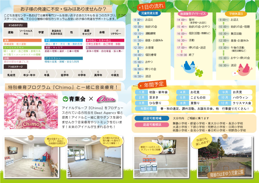 令和8年1月 大分市東浜1丁目12-17にオープン予定の児童発達支援・放課後等デイサービス こども支援センター あおばです。